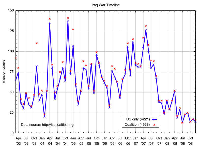 Three consecutive months with fewer than 20 US and coalition military deaths. 314 US deaths in 2008, the fewest in any year of the war. Good news, unless you knew one of the troops behind the numbers.