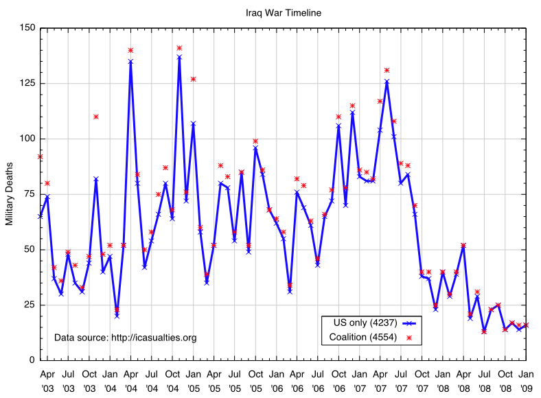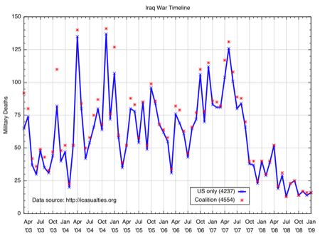 reflecting the growing importance of Afghanistan. 294 coalition troops were killed in Afghanistan in 2008, as compared to 322 in Iraq. Last month, 24 coalition troops were killed in Afghanistan (15 of them from the US), and 16 were killed in Iraq (all from the US).