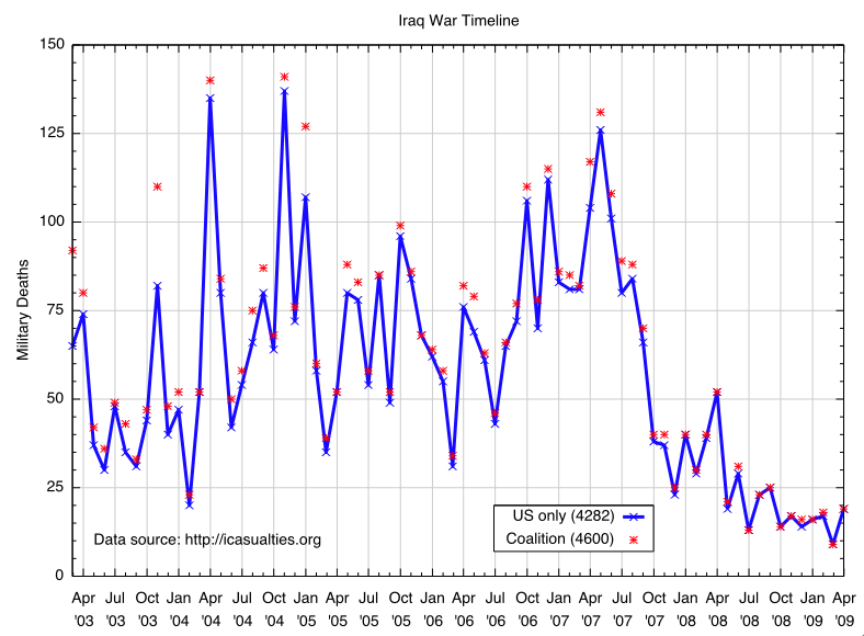 If I were to plot the “Mission Accomplished” photo op, it would have to be squeezed in between the first two data points near the left edge of the graph, over 4500 deaths ago.