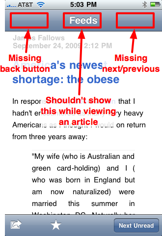 - The Next Unread button never goes away, even if you have no unread feeds. This is a step backward from NNWiP 1 and makes absolutely no sense.