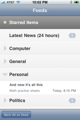 In any event, I’m back to Bloglines; I prefer it on the desktop and it’s plenty good enough on the iPhone. And I’m going to try to resist the temptation to try NetNewsWire again, no matter how good others say it is.