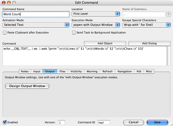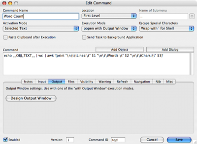 A few weeks ago, John Gruber posted a short tutorial on ThisService, a utility for turning command-line scripts or AppleScripts into items in the Services menu. The example he gave was a word count utility written in AppleScript. I decided to implement the same idea in On My Command.