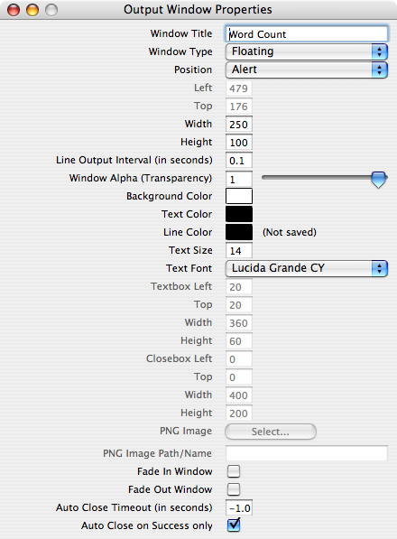 By default, the popup window in which the output is displayed uses 9-point Monaco, a font that’s just too small for my middle-aged eyes. Fortunately, OMCEdit, the OMC companion program, has an option for changing the size, style, font, etc. of the output window. (Apparently, you can also design your own dialog window in Interface Builder and OMC will use the resulting NIB file, but I haven’t tried that yet.) I changed to a smaller window and a bigger, nicer-looking font, and rejiggered the whitespace in the output text to get something that looks better to me.