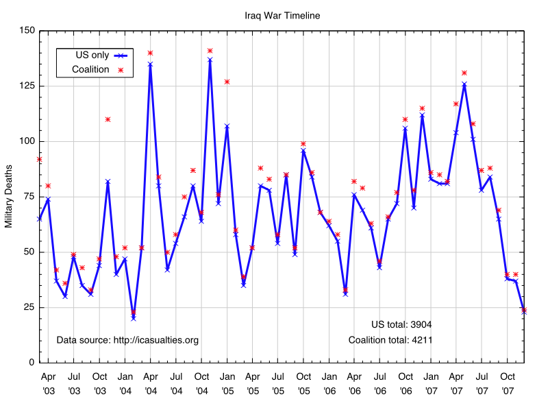 For over a month, I’ve heard and read war supporters saying that there have been “several” months of improvement. This is, at best, a stretch. The death rates in July, August, and early September were quite high compared to most of the war and were only an improvement over the terribly high rates of April through June. This compulsion of right wingers to lie, even when the news is good, is the reason I doubt everything they say.