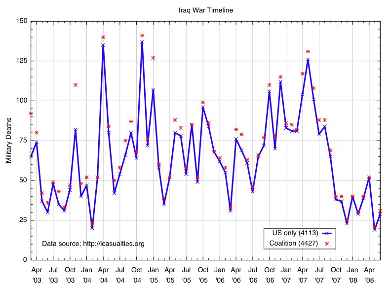 For the past eight months we’ve seen casualty rates that are about a third of what they were over the previous twelve months, but we have yet to see an explanation. “The surge” is not an explanation; its a convenient dodge for supporters of the war. The high military death rates continued for several months after the surge began.