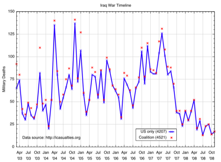 I’m embarrassed to say I missed the day in November on which US military deaths in Iraq passed the 4200 mark. Not good for someone who’s spent a few years complaining about reporters’ failure to keep the nation reminded of the continuing waste of American lives in Iraq.