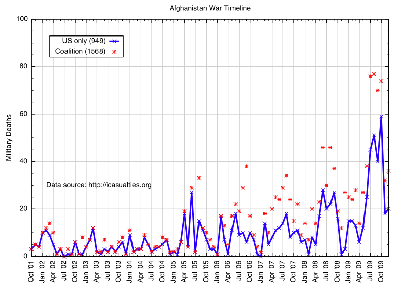 In Afghanistan, the number of US and coalition military deaths was nearly the same as November—distinctly lower than in the summer months, but high compared to the rest of that war’s 8-year history.
