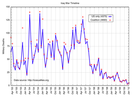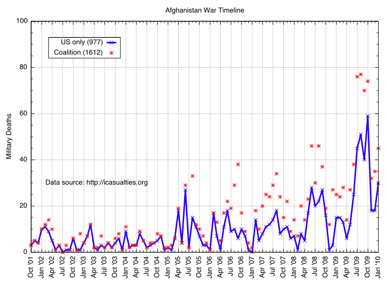 Military deaths in Afghanistan ticked up last month; military deaths in Iraq stayed very low.
