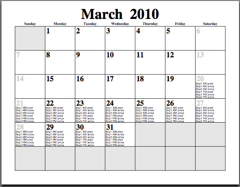 Ear infections and an asthma flareup have hit the Drang haus and we now have a pile of medicine to dose our boys with—so much, my wife asked me to make up a calendar so we could keep track of it all. I turned to Pcal, Python, and TextMate to whip one up quickly.