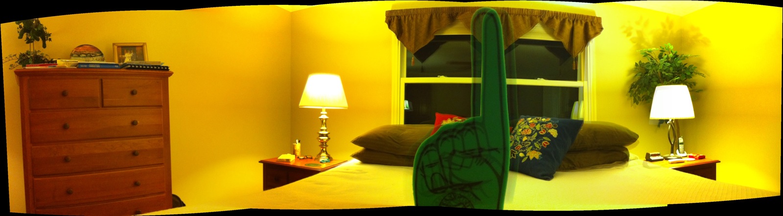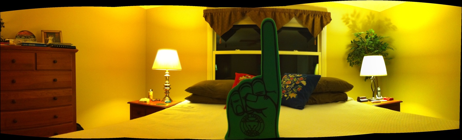 Note the nasty ghost image of the foam finger in the first panorama, the result of parallax that AutoStitch just couldn’t compensate for. The ghost is gone in the second panorama. The two-finger grip certainly can’t eliminate parallax, but it can reduce it to a point where AutoStitch can handle it.