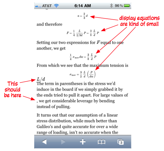 The equations on the iPhone look very sharp, but they’re not using webfonts because Mobile Safari doesn’t support them. Zoom in far enough and you can see that they’re images.