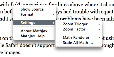 Unlike jsMath, MathJax doesn’t put a little button to access its settings in the bottom of your browser window. Instead, you have to right-click on the equation itself.