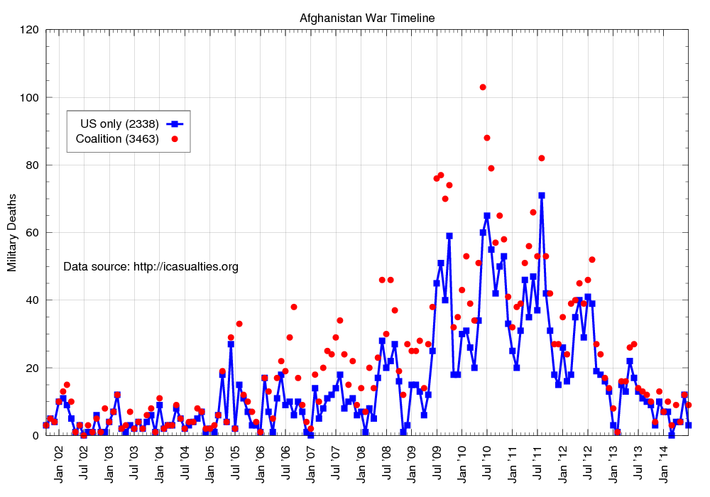 Afghanistan made the news today, mainly because Major General Harold Greene was killed in an “insider attack” at a training base for Afghan soldiers. General Greene isn’t in this graph, but he’ll appear in the next one, joining nearly 3500 others.